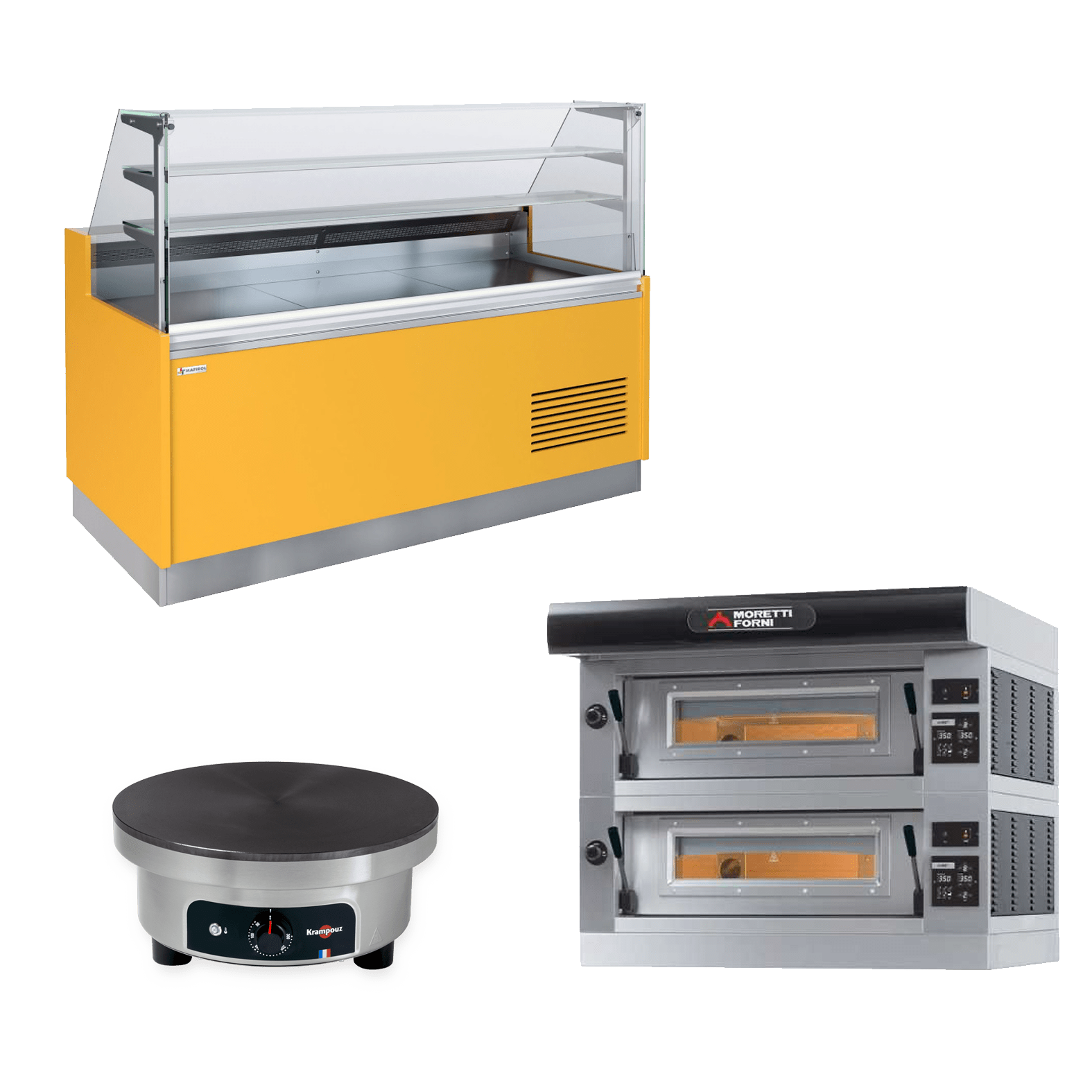 Vitrines et comptoirs : vitrines réfrigérées, chaudes, salad bars et présentoirs adaptés au snacking.